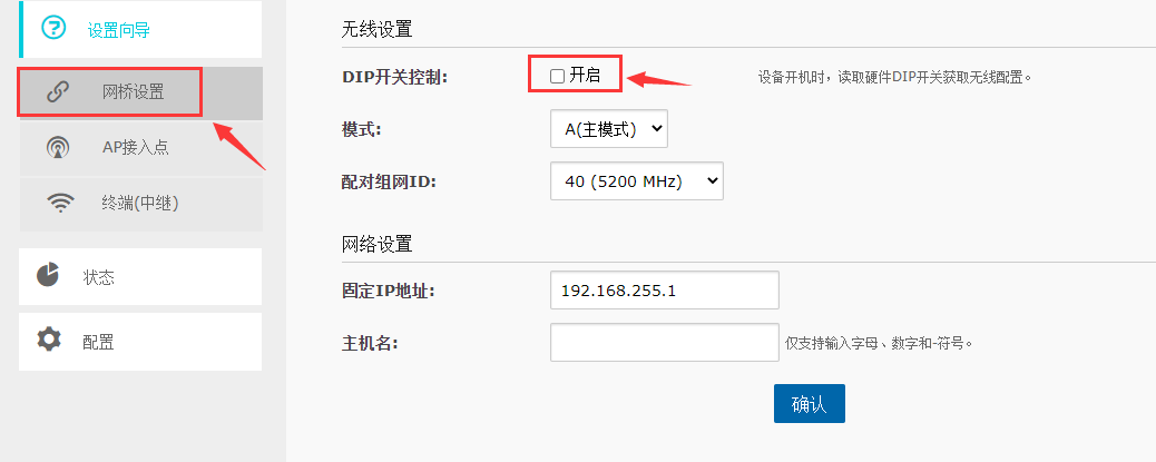 3. 设置向导—网桥设置--关闭DIP开关,
