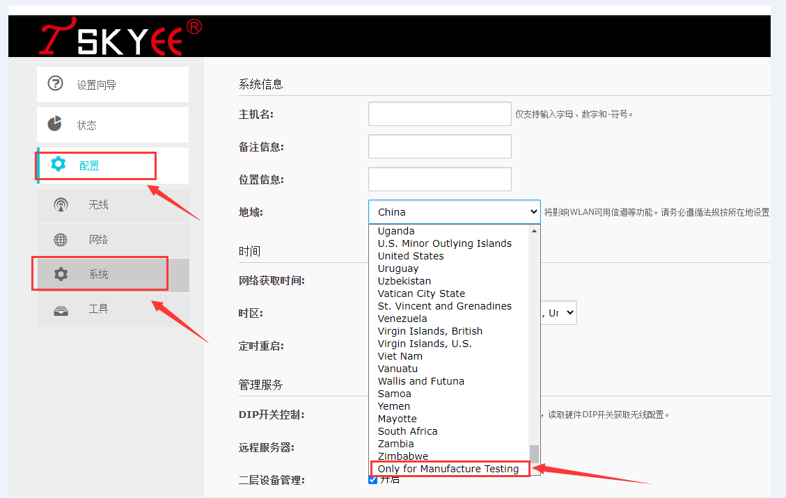 4. 配置—系统--地域选择“Only tor Manutacture Testing”